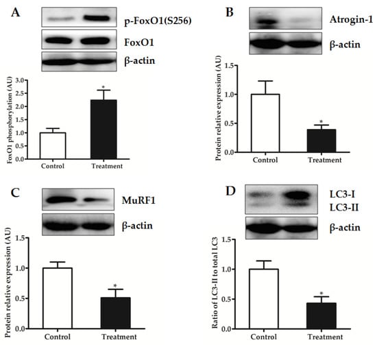 Moreover, after an overnight fasting, muscle phosphorylation of FoxO1, another important target of Akt, was higher in BCAA-supplemented group than in control group (p < 0.05) (Figure 6A). Correspondingly, relative protein levels of atrogin-1 (Figure 6B) and MuRF1 (Figure 6C), as well as the LC3-II to total LC3 ratio (Figure 6D), were decreased by BCAA supplementation (p < 0.05).