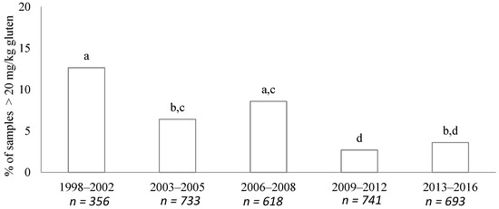 Evolution of gluten-containing samples (>20 mg/kg), sorted by five periods (1998–2002, 2003–2005, 2006–2008, 2009–2012, and 2013–2016). Data are expressed as the percentage of total samples analyzed in each period. Bars not sharing a common letter (a, b, c, d) are significantly different (p < 0.05).