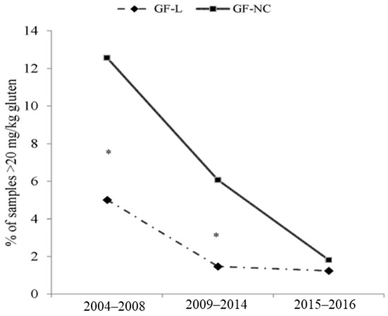 Evolution of gluten-containing samples (>20 mg/kg) sorted by three time periods related to gluten regulation (2004–2008, 2009–2014, and 2015–2016). From the total number of 2614 samples, 1652 were gluten-free-labeled products (GF-L) and 962 reportedly gluten free, but not certified, products (GF-NC). Data are expressed as percentages of the total sample analyzed in each period. Significantly different time period are expressed as * (p < 0.05).