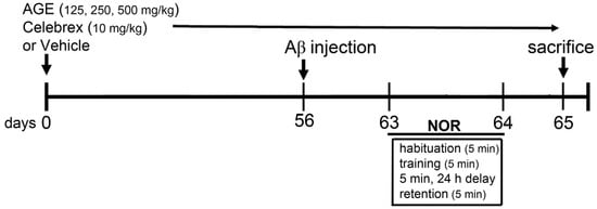 Aβ (1-42) peptide (Alexis Biochemicals, San Diego, CA, USA) was dissolved in glacial acetic acid at a concentration of 1 µg/µL, and the solution was incubated at 37 °C for 24 h to induce peptide aggregation. The aliquots were stored at −20 °C until the moment of use. Forty-eight rats were randomly divided into six groups (n = 8). Group 1 was the control group, consisting of healthy rats that did not receive any treatment. The rats in Group 2 (V + Aβ) were fed distilled water. Those in Group 3 (Celeb + Aβ) were fed Celebrex at 10 mg/kg BW. Finally, the rats in Groups 4, 5, and 6 (AGE125 + Aβ, AGE 250 + Aβ and AGE500 + Aβ) were fed with AGE at 125, 250, and 500 mg/kg BW, respectively. The treatments were administered daily for sixty-five days. At day fifty-six, all rats in Groups 2–6 were injected with 1 μL of aggregated Aβ (1-42) peptide into each lateral ventricle, bilaterally at a rate of 0.2 μL/min [] using the following coordinates: AP −0.8 mm from bregma; ML ± 1.5 mm from bregma; SI −3.8 mm from dura []. Seven days after Aβ (1-42) injection, all rats were tested for novel object recognition (NOR) (Figure 1). They were then sacrificed and the density of microglia and concentration of IL-1β and TNFα in the cerebral cortex and hippocampus were determined.