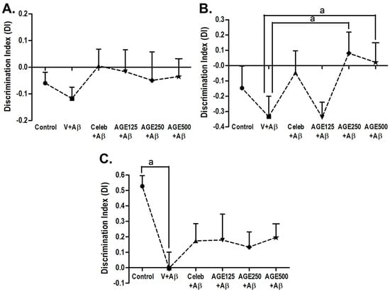 The discrimination index (DI) in the training phase (A); after a five-minute delay (B) and 24 h delay (C) in the novel object recognition test. Data are presented as mean ± S.E.M. (standard error of mean), a = significant differences from vehicle + Aβ group at p < 0.05.