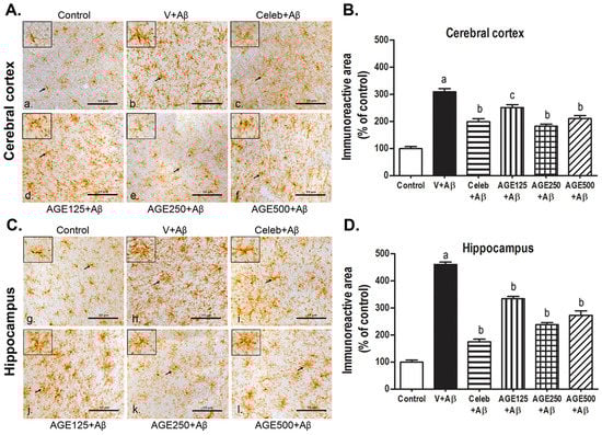 CD11b is a member of the integrin family that expresses on the surface of microglia. Increased expression of CD11b represents microglia activation during neurodegenerative inflammation. In this study, the determination of CD11b immunoreactivity was performed as a measure of microglia activation. Microglia in two regions of the control brain sections were generally found to have a ramified morphology (Figure 3a,g). In Aβ (1-42) treated rats, the microglia showed various clusters of cells with shortened and thickened processes similar to amoeboid morphology, indicating activated microglia (Figure 3b,h). Some microglia remained ramified with small cell bodies, and some became hypertrophic with strongly stained cell bodies and thicker processes were seen in the AGE-(Figure 3d–f,j–l) and Celebrex-treated rats (Figure 3c,i). Some aggregation of microglia could also be observed in the AGE- and Celebrex-treated rats. The CD11b immunoreactivity in the cerebral cortex and hippocampus were also analyzed as percentage of labeled area. They were significantly higher in the Aβ (1-42)-treated groups when compared to the control group (a, p < 0.001; Figure 3B,D). However, the activation of microglia was significantly inhibited after Aβ (1-42) injection in animals treated with Celebrex and all doses of AGE (b, p < 0.001 and c, p < 0.01; Figure 3B,D) in both regions of the brain, compared with those animals treated with saline.