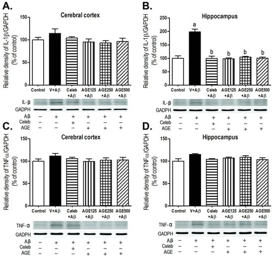 Activated microglia cells are significant sources of proinflammatory cytokines and neuroinflammation. This study investigated the density of two proinflammatory cytokines, IL-1β and TNFα, induced by Aβ (1-42) peptides using Western blotting analysis. Treatment with Aβ (1-42) significantly increased the density of IL-1β in the hippocampus, but not in the cerebral cortex when compared to control group (a, p < 0.001; Figure 4A,B), whereas the density of TNFα in both regions of the rat brain (Figure 4C,D) did not change. The treatment of AGE at all doses markedly decreased the up-regulation of IL-1β in the hippocampal region of the rat brain in a similar fashion as did Celebrex (b, p < 0.001; Figure 4B).