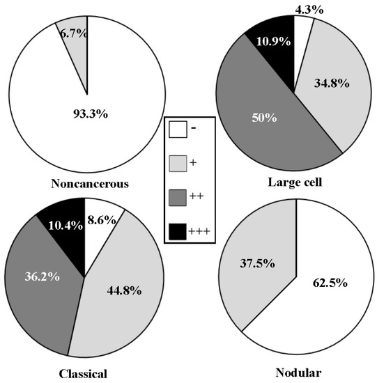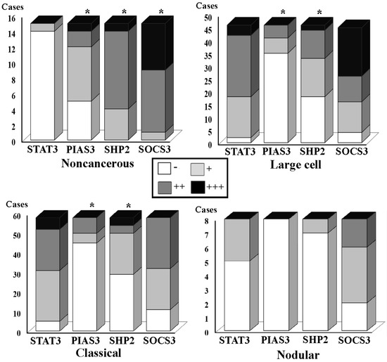 The concurrent p-STAT3 nuclear translocation and p-SHP2, SOCS3 and/or PIAS3 down-regulation are summarized in Figure 3, followed by correlative analyses to elucidate the relevance of p-STAT3 nuclear translocation and the expression levels of p-SHP2, SOCS3 and PIAS3, respectively. Statistical correlations were established between p-STAT3 nuclear translocation and the level of SOCS3 (R = 0.333; p = 0.047) or PIAS3 expression (R = −0.494; p = 0.002) but not p-SHP2 down-regulation (R = 0.02; p > 0.05) in the large-cell medulloblastomas. Inverse correlation could be established between p-SHP2 (R = −0.35; p = 0.029), SOCS3 (R = 0.495; p = 0.001) or PIAS3 expression (R = −0.352; p = 0.020) and p-STAT3 nuclear translocation in the classic medulloblastomas. The corresponding data of the nodular group were not analyzed due to the limited case number.