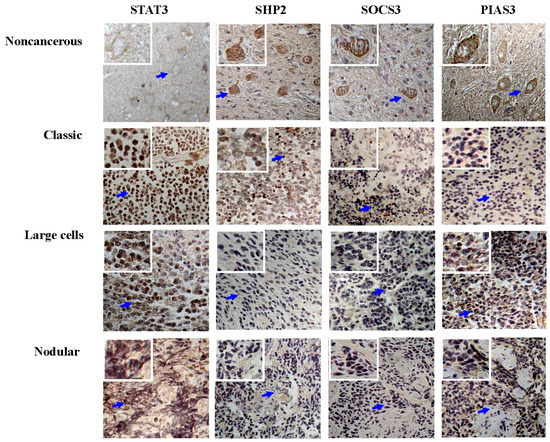 Immunohistochemical illustration (20×) of expression levels and intracellular distribution patterns of STAT3, SHP2, SOCS3 and PIAS3 in the three medulloblastoma subtypes and the tumor-surrounding cerebellum tissues. The arrows indicate the regions shown in the insets with higher magnification (40×).
