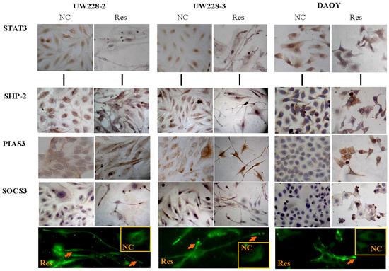 Immunocytochemical demonstration of STAT3, p-SHP2, SOCS3 and PIAS3 expression in three human medulloblastoma cell lines without (NC) and with 100 μM resveratrol treatment (Res) for 48 h (20×). Arrows in the immunofluorescent images (40×) indicate SOCS3 accumulation in the distal end of the axon-like processes of the three resveratrol-treated medulloblastoma cell lines. The inset images are the normally cultured cells.