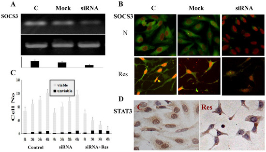 Knockdown of SOCS3 expression and its influence in STAT3 activation, resveratrol-sensitivity and axon-like process regeneration of medulloblastoma UW228-3 cells. (A) RT-PCR demonstration of SOCS3 downregulation in SOCS3-specific siRNA transfected UW228-3 cells (siRNA). The normally cultured (C), and mock RNA transfected (mock) cells are used as controls; (B) Immunofluorescent illustration (20×) of SOCS3 expression and intracellular distribution in normally cultured (C), mock RNA transfected (mock) and SOCS3-specific siRNA transfected UW228-3 cells (siRNA) before (N) and after resveratrol treatment (Res); (C) Viable:nonviable cell counting (mean cell number/visual field) reveals no influence of SOCS3 knockdown in the proliferation and resveratrol sensitivity of UW228-3 cells. N, UW228-3 cells without siRNA transfection; siRNA, normally cultured SOCS3 siRNA transfected UW228-3 cells; siRNA+Res, 100 μM resveratrol-treated UW228-3 cells with SOCS3 siRNA transfection; (D) SOCS3 knockdown exerts little effect on STAT3 activation in normally cultured cells (C) and resveratrol-caused STAT3 inactivation of UW228-3 cells (Res).