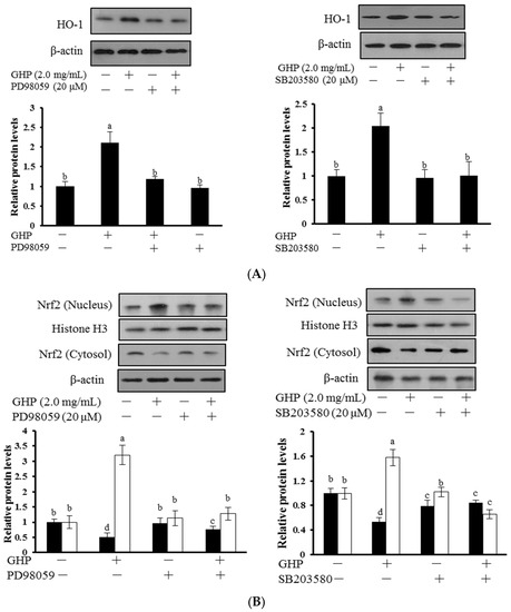 To gain further insight into the molecular mechanisms involved in the cytoprotective effect of GHP, the role of ERK1/2 and p38 MAPK upstream signaling in GHP-induced Nrf2 activation and HO-1 expression were elucidated. Cells were incubated with 2.0 mg/mL GHP for 12 h after pre-incubating for 2 h with SB203580 (an inhibitor of p38) and PD98059 (an inhibitor of ERK1/2), respectively. Then the protein expression level of Nrf2 and HO-1 was determined (Figure 5). GHP treatment induced nuclear Nrf2 accumulation, decreased Nrf2 expression in cytosol, and increased protein expression of HO-1, whereas inhibitors of ERK1/2 and p38 MAPK strongly reduced GHP-induced HO-1 expression (Figure 5A) and nuclear translocation of Nrf2 (Figure 5B). These results indicated that ERK1/2 and p38 were involved in GHP-induced activation of the Nrf2/HO-1 pathway.
