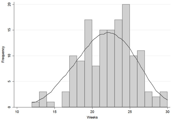 In order to perform the logistic regression analyses described below, the sample was divided into two groups based on the timing of the first introduction of complementary food. The cut-off was set at 21 weeks, which was the median of the distribution curve (Figure 1). The 21 weeks value had the additional advantage of falling in the middle of the ESPGHAN recommended window (17 to 26 weeks). This timing distribution was used as dependent variable.