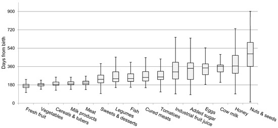 The median age of introduction of solid foods was 5.2 months (min 2.8; max 7.2). The interval between the first tasting and the complete introduction of the different food categories ranged from 6 to 32 days. The range was narrower for food groups such as dairy products, vegetables, and cereals (6, 6, and 7 days, respectively) and wider for honey, sugar, and cow milk (32, 29, and 22 days, respectively). The timetable of the complete introduction of each food category is reported in Figure 2.
