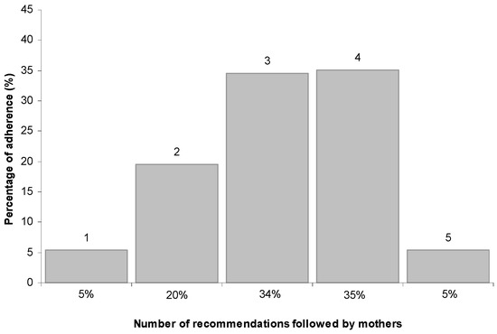 As shown in Figure 3, eight mothers (5%) complied with all five recommendations and eight (5%) complied with only one, while 34% complied with at least three recommendations. Within this subgroup, the least frequently adhered to recommendation was the introduction of complementary feeding after the age of six months (19%).