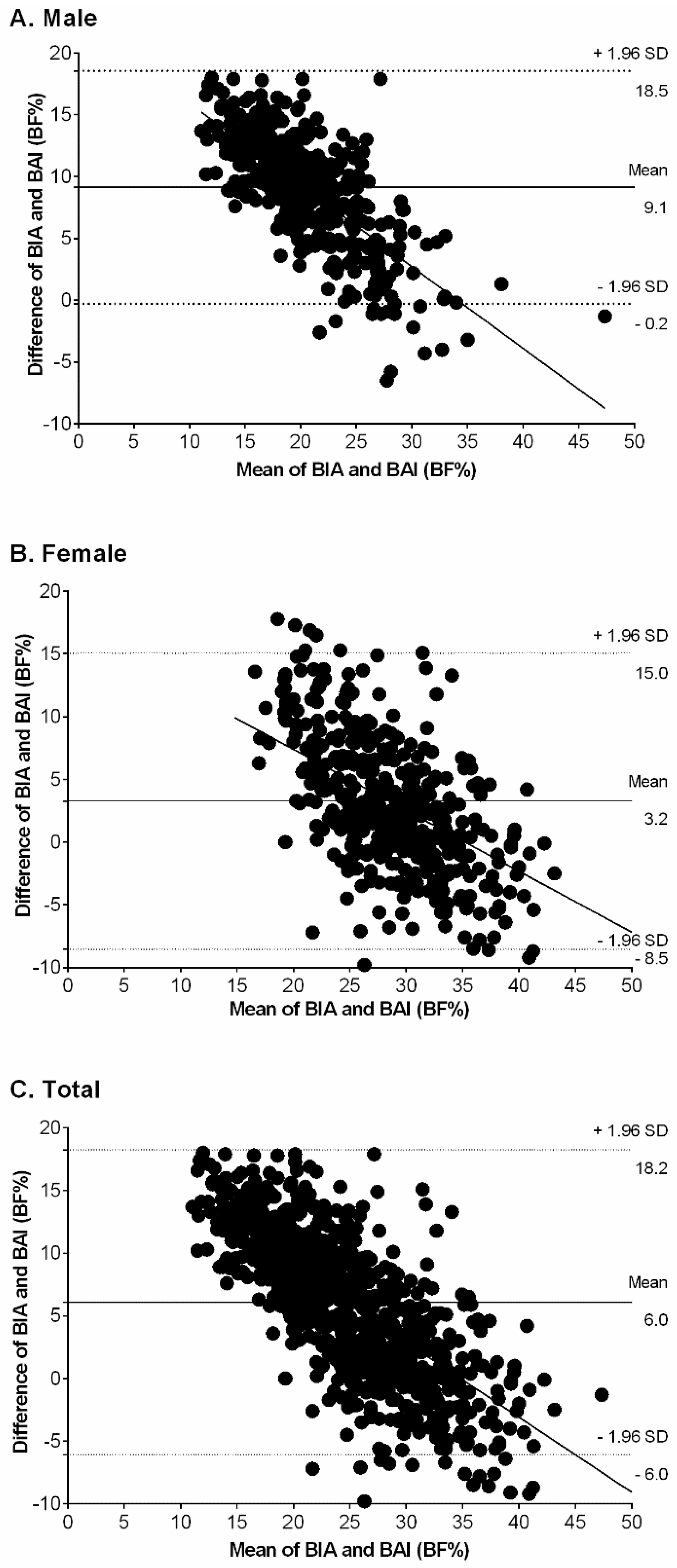 | Present study | 903 apparently healthy and sub-sample with overweight/obese | Mean age 21.4 ± 3.3 | Tetrapolar frequency | Bland–Altman plots Male bias 9.1%, Female bias 3.2%, Total bias 6.0% | Overall, BAI overestimating BF%, in overweight subjects the BAI overestimated BF%, and obese group the BAI underestimated BF% both genders. |