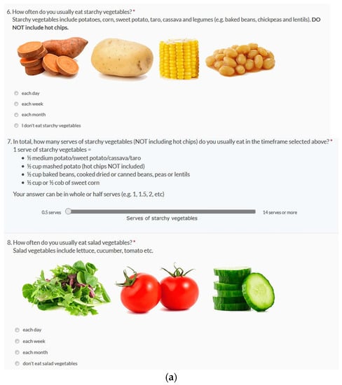 The CSIRO Healthy Diet Score survey contains the 38 questions asking about the frequency and amounts of different foods consumed, food choices, and variety—the same as the Short Food Survey. In addition, the CSIRO Healthy Diet Score survey contained coloured images of example foods included in each question. The portion size of the images were selected to be as realistic as possible, however were not intended to be exact serve sizes in all instances (Figure 1). The survey was programed into a readily available survey platform. On completion, individuals receive an immediate Diet Score on completion of the survey, as well as three personalized suggestions for areas to improve.