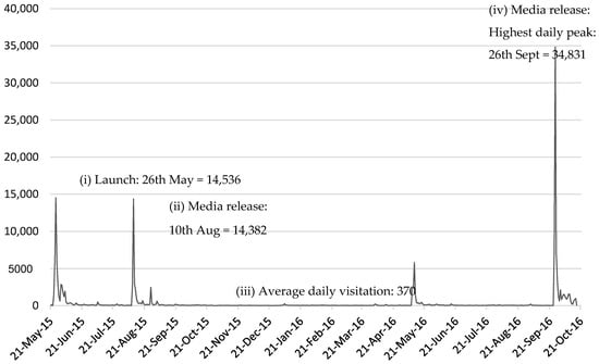 Number of people who have started the CSIRO Healthy Diet Score survey from (i) launch (21 May 2015) to current (17 October 2016) with key peaks in visitation at (ii and iv) the key media releases and (iii) average daily visitation highlighted.