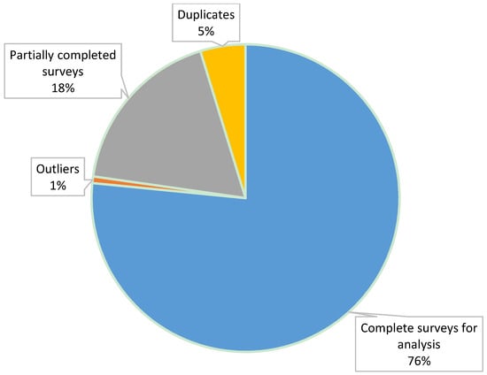 The CSIRO Healthy Diet Score survey is currently a live website, meaning data collection is continuous and ongoing. The survey went live on the 21 May 2015 and CSIRO and SP Health coordinated four media releases: (i) a small scale media on 21 May associated with the launch; (ii) a major release about the first results of the survey conducted on 10 August 2015; (iii) a second small scale release marking one year since launch; and (iv) a second major release of findings on 26 September 2016. The two major releases received national television, print, and radio coverage across a range of free to air television channels (e.g., news and current affairs programs), Australian print newspapers and internet stories, and local and national radio programs. The peaks in visitation to the survey corresponded with these publicity campaigns (Figure 2). This paper describes data collected from individuals who completed the survey from when it went live on the 21 May 2015 through to the 17 October 2016. During this period, the survey was commenced 190,667 times. Duplicates were identified using an ID variable (n = 9046) and individuals’ first attempt of completing the survey was included in the present analysis. Of the 181,621 surveys by unique users, 34,323 surveys were only partially completed, leaving 147,298 complete surveys. Outliers were identified and removed based on extreme age (less than 18 and older than 100 years removed), Body Mass Index (less than 13 and greater than 97 removed), height (less than 1m and greater than 3 m), and weight (less than 13 kg and greater than 250 kg). In total 1323 surveys were removed based on the above criteria, leaving 145,975 surveys for analysis (76.6% of those that commenced the survey, Figure 3). According to the summary statistics provided by the survey platform, the highest drop off between pages of the survey was 4% between page 2 about fruit and page 3 about vegetables. The drop between the remaining pages was 0%–2%, and there was no pattern to this drop off.
