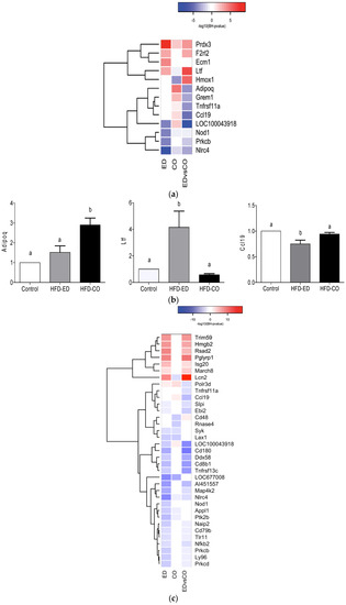 NF-κB is a transcription factor that regulates transcription of pro-inflammatory cytokines such as interleukin 6 and 12, interferon-gamma, and tumor necrosis factor [17,46]. Our study shows that HFD-ED can down-regulate certain tumor necrosis factors, as well as toll-like and nod-like receptors that are involved in activation of NF-κB transcription factor compared with the HFD-CO and control diets (Figure 2a,b). In addition, HFD-ED up-regulates the gene for peroxiredoxin 3 (Prdx3) involved in mitochondrial homeostasis [47]. This gene has been shown to be up-regulated in adipocyte oxidative stress, mitochondrial biogenesis and adipokines expression [48].