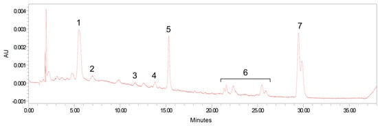 Representative high pressure liquid chromatography (HPLC) separation of carotenoids from serum. Peaks: 1, lutein; 2, zeaxanthin; 3, β-cryptoxanthin; 4, α-carotene; 5, β-carotene; 6, cis-lycopene isomers; and 7, all-trans lycopene plus 5-cis lycopene