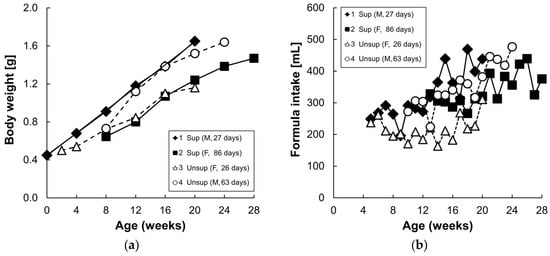 Body weight (a) of each infant monkey and daily formula intake consumed by infant monkeys (b) for 16 weeks. Each symbol represents one animal; solid symbol and solid line denote supplemented formula (Sup) while the open symbol and dotted line denote unsupplemented formula (Unsup).