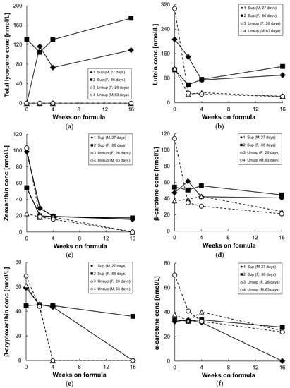 Figure 3 shows plasma/serum carotenoid concentrations at baseline, and following 2, 4, and 16 weeks of formula feeding. At baseline, β-cryptoxanthin, α-carotene, β-carotene, lycopene, lutein, and zeaxanthin were detected in both groups, and the high baseline values are presumably largely due to the highly bioavailable carotenoid supply from breast milk [26]. In addition, the carotenoid levels at baseline were variable, perhaps due to variable breastmilk composition or intake. After 2–16 weeks of formula feeding, levels of all measured carotenoids decreased in the unsupplemented formula group. In the supplemented formula group, only serum lycopene levels increased at 16 weeks compared to their baseline values, due to the high concentration of lycopene in the supplemented formula (Figure 3a). Serum lutein concentrations decreased in both groups from baseline to four weeks on formula, but less so in the supplemented group; as a result, there was a three-fold difference in serum lutein levels between the two groups at 4 weeks (Figure 3b). By 16 weeks on supplemented formula feeding, serum lutein levels increased slightly from levels at four weeks, and were five times higher than in the unsupplemented group. Serum zeaxanthin levels dropped until four weeks of formula feeding in both groups (Figure 3c); they were undetectable in the serum of unsupplemented group by 16 weeks but were maintained in the supplemented group from four to 16 weeks. Serum β-carotene levels also were maintained in the supplemented group from four to 16 weeks and were two times higher than in the unsupplemented group by 16 weeks (Figure 3d). Plasma/serum α-carotene and β-cryptoxanthin levels gradually decreased in both groups from baseline to 16 weeks since these two carotenoids were not present in the formulas (Figure 3e,f).