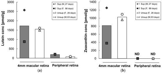 Lutein (a) and zeaxanthin (b) concentrations in each retina region of infant monkeys fed either supplemented formula (n = 2) or unsupplemented formula (n = 2) for 16 weeks. Each symbol represents individual animal; each column represents mean concentration of lutein of two animals. Solid column denotes supplemented formula (Sup) while open column denotes unsupplemented formula (Unsup). ND: not detected.