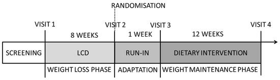 Group comparisons of variables assessed at baseline (visit 1) and prior to the dietary intervention (visit 3) as well as dropout rate were done using a one-way ANOVA or Mann–Whitney Wilcoxon tests, as appropriate, for quantitative parameters, and a chi-squared (χ2) or Fisher’s exact test, as appropriate, for qualitative parameters. Group differences in changes in outcomes assessed during the LCD phase (between visits 1 and 2) and during the dietary intervention (between visits 3 and 4) were assessed using a one-way ANCOVA with group (RG or WG) as a fixed variable and corresponding baseline (visit 1 or 3) value and age as a covariate. Both complete case (CC) and intention-to-treat (ITT) analyses were performed, but CC analyses were considered the primary analyses of interest. All data are presented as means with SD unless otherwise indicated. Differences were considered significant at p < 0.05.