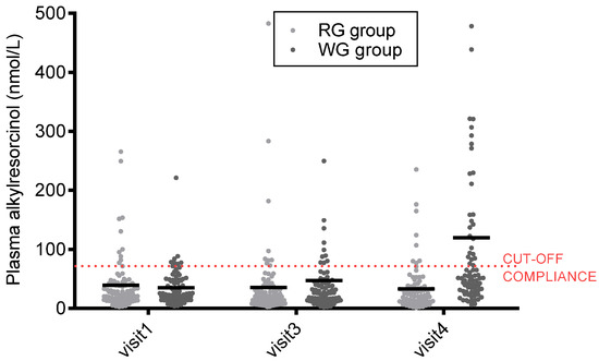 Dietary intake data based on 3-day food records are presented in Table 2. There was no difference at baseline for total energy and macronutrient intake. During the intervention, there was a higher reported intake of dietary fibre and lower reported intake of fat in the WG group. Mean daily intake of whole-grain foods in the RG and WG group after 12 weeks was reported to be 0.5 (SD 1.6) g and 124 (SD 1.7) g, respectively (p < 0.0001). Based on a detailed diet analysis on a random selection of six participants, the average (min; max) proportion of grains eaten on the WG diet was 79 (64; 90) % wheat, 16 (6; 29) % rice, 4 (0; 12) % oats, and 1 (0; 6) % rye. The main grains eaten on the RG diet were wheat and rice. Plasma alkylresorcinol concentrations were 119 (SD 181) nmol/L in the WG group and 33.6 (SD 38.9) nmol/L in the RG group after the dietary intervention, and the change from visit 3 was significantly different between groups (p < 0.0001) (Table 3), even though 62% of the participants in the WG group had plasma alkylresorcinol concentrations <70 nmol/L, which was applied as a conservative cutoff for compliance (Figure 2). Plasma alkylresorcinols and reported whole-grain intake in the WG group after the dietary intervention (visit 4), however, did not correlate (Spearman’s correlation coefficient R = −0.02919; p = 0.85), which indicates poor compliance (Figure 3).