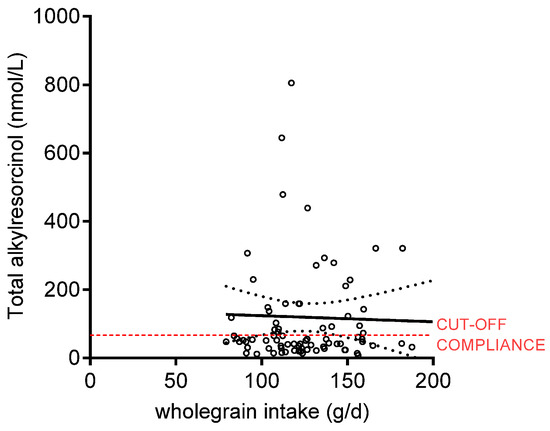 Figure 3. Correlation between reported mean whole-grain intake (g/day) during the 12-week dietary intervention and plasma alkylresorcinol concentration (nmol/L) measured at visit 4 with 95% confidence intervals for participants in the WG group (n 81).