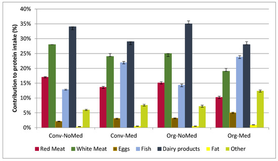 Figure 1 showed differences in contribution of food groups to animal protein intake, between groups. Main sources of animal proteins were dairy products (28%) and fish (24%) in the Org–Med group while in other groups the main sources were dairy products followed by white meat. Conv–NoMed participants had the highest contribution of red meat.