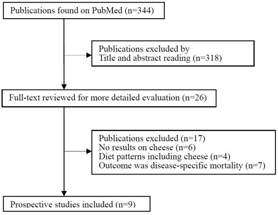 The flow chart of the literature search is presented in Figure 1. The initial search of the PubMed database identified 344 records, most of which were excluded because they were not prospective studies or because the exposure or endpoint was not relevant to our analysis, leaving 26 potentially eligible papers for full-text review. Publications were further excluded mainly because the exposure of interest was dairy intake with no data on cheese consumption (n = 6) or was specific diet patterns including cheese (n = 4). Seven studies were excluded because the outcome was CVD mortality [18,19], coronary heart disease (CHD) mortality [20,21] or stroke mortality [22,23,24] without data on all-cause mortality. Finally, nine independent prospective studies were included in the meta-analysis of cheese consumption and risk of all-cause mortality [7,25,26,27,28,29,30,31,32].