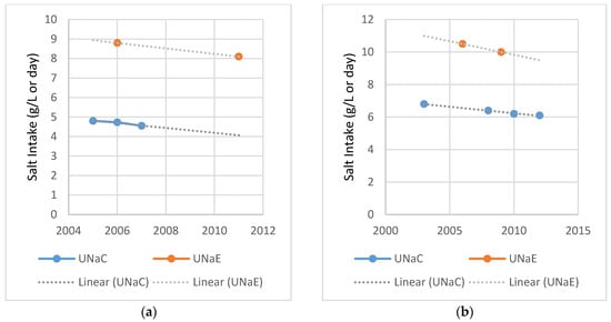 UNaC survey data can be used to estimate average population salt intakes and it should, therefore, be possible to compare the salt intake estimates between countries. The interpretation of differences in estimated salt intakes between countries is not a straightforward matter, however, because of the variable age structure of the survey participants and because of differences in conversion equations and in the reporting of results [22,23,30,31,32,34,35,36]. The bleakest methodological difference in the country data set of Table 1 is that the England and Scotland surveys report values for salt intake in the original UNaC units, i.e., without conversion to daily intakes, while each of the other surveys report intake estimates obtained from a conversion of UNaC. As expected, the reported England and Scotland values are substantially lower than the values of the other countries because they are expressed per liter as opposed to per day. For the countries that did adjust their UNaC findings to predicted-UNaE, the estimates do provide accurate average daily salt intakes, but each country elected to use a different conversion formula. As the different equations have been shown to provide different estimates [32,36,37,38], caution must be exercised when comparing the country estimates. An additional difference in analysis methodology is that the countries did not use the same measure for reporting the average intake estimate—some used the arithmetic mean, others the geometric mean, and yet others the median. Distributions that are not normally distributed, as may be the case for unadjusted UNaC values, can yield different measures of central tendency.