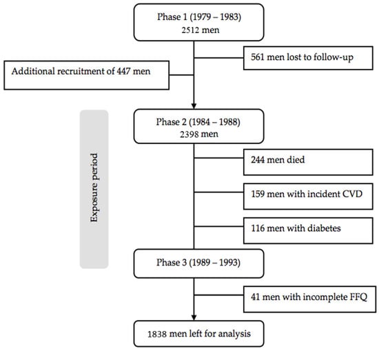 The CaPS was set up to study the influence of CVD risk factors in the development of coronary heart disease (CHD) [12], and recruited an initial 2512 men, aged 45 to 59 years living in the town of Caerphilly and five adjacent villages, South Wales, UK (response rate 89%). Data-collection phases were at 5-year intervals: 1979–1983 (phase 1), 1984–1988 (phase 2), 1989–1993 (phase 3), 1993–1997 (phase 4), and 2002–2005 (phase 5). At phase 2, an additional 447 men, aged 50 to 64 years, were included as a result of 561 men being lost to follow-up, which gave a new total of 2398 men for the entire cohort. As a result of this change to the cohort, it was deemed necessary to consider phase 2 as baseline in the present study. Before phase 3 measurements, 244 men who died, 159 men who had history of myocardial infarction or stroke and 116 men who had diabetes were excluded from the analyses. After excluding 41 men with incomplete dietary intake data at phase 2 or phase 3, 1838 men were included in the analyses. A flowchart of participants through the study is outlined in Figure 1. Written informed consent was obtained from all subjects included in the study, and the study was approved by the local research ethics committee and adhered to the Declaration of Helsinki.