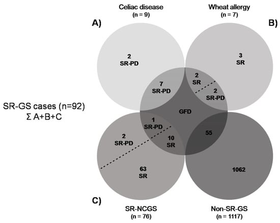 Following a GFD without a known diagnosis of celiac disease has been proposed as a surrogate marker for SR-NCGS []. Under these criteria, the estimated SR-NCGS prevalence rate was 5.78% in the present study. Due to the inclusion of non-SR-GS cases that reported current adherence to a GFD, the main limitation of this approach is that overestimate the prevalence of SR-NCGS currently following a GFD. In fact, this prevalence rate was 0.91% in the studied population, which is closer to the NCGS prevalence rate expected in Italians (slightly higher than 1%) []. Furthermore, this prevalence rate is not far from that reported in U.S. population (0.548%) applying the criteria described above []. Although in the U.S. study the authors stated that in-person physical examinations were performed and health questionnaires were applied to the participants of the study, the characteristics of the participants who met criteria for SR-NCGS in relation to the symptoms triggered after wheat/gluten intake were not stated [], and this could lead to misinterpretation of the results. Accordingly, we have indicated that SR-NCGS prevalence rates estimations should be interpreted with caution and special attention should be paid to study designs [] and the given definitions of SR-GS and/or SR-NCGS.