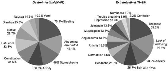 Gastrointestinal symptoms were reported for 87 out of 92 SR-GS cases. The most commonly reported gastrointestinal symptoms were bloating (n = 61; 70.1%), abdominal discomfort (n = 41; 47.1%), and stomachache (n = 40; 46.0%) (Figure 3). Extraintestinal symptoms were reported for 45 SR-GS cases. The most common extraintestinal symptoms were tiredness (n = 25; 55.6%), lack of wellbeing (n = 20; 44.4%), and anxiety (n = 13; 28.9%) (Figure 3). These symptoms, either gastrointestinal or extraintestinal, were also the most common manifestations in SR-NCGS cases (Supplementary Materials Figure S1). Bloating and stomachache were the most common symptoms in those who reported adverse reactions to foods other than gluten (Supplementary Materials Figure S2). Comparisons between the SR-GS and self-reported recurrent adverse reactions to foods other than gluten groups showed significant differences for bloating and constipation (p < 0.05) (Supplementary Materials Table S2).