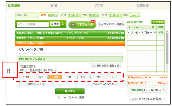 Choosing the serving size for a dish using the Japanese version of Asken. After selecting the specific dish, users select the appropriate serving size for the dish they consumed. Translation of serving sizes in area B (left to right): 1/4 of the serving, 1/2 of the serving, 3/4 of the serving, 1 serving, 1.5 servings, 2 servings, and 3 servings.