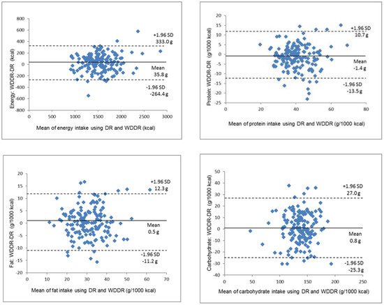 In Bland–Altman plots, a greater range of significant difference means a larger error, but the allowable range of significant difference depends on the study [27,28]. Another study comparing the FFQ and the DR in Mexico [29] found that the average energy intake according to the DR was 2041 kcal, and the range of significant difference was between −1070 and 2190 kcal, which was larger than for our study. Furthermore, another study evaluating individual nutrient intakes in the Japanese population using a Bland–Altman plot examined the estimation accuracy of the energy intake according to the weighed DR using the double-labeled water method [30] and found that the range of significant difference for energy intake in women was between −1396 and 952 kcal/day, which was greater than for our study. Our study cannot be simply compared with most previous studies on the validity of the FFQ, but the energy intake errors for individuals using the WDDR in this study were relatively small. Additionally, regarding the protein, fat, and carbohydrate intakes, statistical errors were small compared to other studies using the Bland–Altman plot [23,31]. This suggests that website users can effectively use the WDDR to estimate their energy, protein, fat and carbohydrate intake.