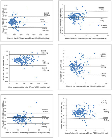 Figure 4, Figure 5 and Figure 6 show the Bland–Altman plots of the energy and nutrient intake. For the energy, protein, fat, and carbohydrate intake, obvious systematic errors could not be confirmed. The range of significant differences for energy, protein and carbohydrates were between −261.4 and 333.0 kcal, −13.5 and 10.7 g, and −25.3 and 27.0 g, respectively. These values from the WDDR were one-third to around one-half of the mean DR values, and the average energy intake on the WDDR was 35.8 kcal higher than that of the DR. Differences in the vitamin and mineral (vitamin A, vitamin B1, vitamin B2, vitamin C, vitamin E, calcium, iron and sodium) intake and dietary fiber increased as the average value increased, showing a tendency for proportional bias.