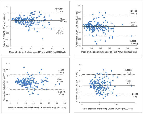 Bland–Altman plots for agreement between energy-adjusted intakes of nutrients (vitamin C, cholesterol, dietary fiber and sodium) using the DR and WDDR for 163 women for 1 day. DR: dietary record; WDDR: website dish-based dietary record; SD: standard deviation.