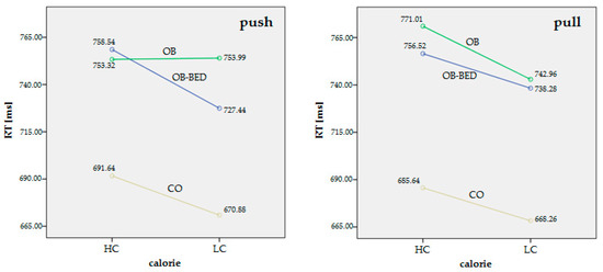 The rm-ANOVA with RTs as dependent variables and “group” (here: OB-BED vs. OB vs. CO) and “depression” as between-subject factors, revealed no main effect for “group” (F2,70 = 2.85; p = 0.07) or “depression” (F1,70 = 0.34; p = 0.56). There was also no main effect for “direction” of motion (F1,70 = 0.03; p = 0.87). However, there was a main effect for “calorie” content (F1,70 = 24.69; p < 0.001). Thus, RTs were significantly different depending on whether the presented cues were high calorie (slower RTs) or low calorie (faster RTs). Interestingly, a significant interaction “group” × “calorie” × “direction” (OB-BED/OB/CO × HC/LC × push/pull) (F2,70 = 4.02; p = 0.02) was found, indicating that the groups had significantly different RTs with regard to “calorie” and “direction” of motion.