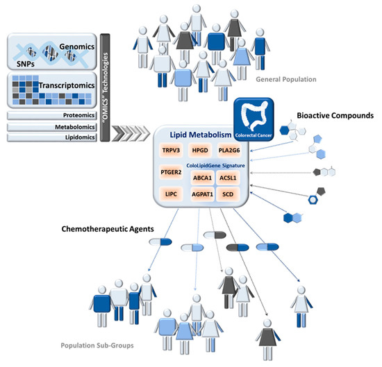 Modulation of Lipid Metabolism in Colorectal Cancer by Precision Nutrition Approaches. Genomics, transcriptomics, and other “omics” technologies have significantly contributed to the development of precision nutrition, which aims to identify patient subpopulations and design new targeted strategies for personalized treatment. Alterations in lipid metabolism have been implicated in cancer-metabolic progression. Examples of lipid-metabolic genes that have been interrogated for precision nutrition uses in colorectal cancer (CRC) are detailed. Bioactive compound could modulate lipid-metabolism-related gene expression. Their use together with classical chemotherapeutic agents, whose effect could be potentiated, is one of the current lines of research in CRC treatment. HPGD: hydroxyprostaglandin dehydrogenase 15-(NAD), PLA2G6: phospholipase A2 group VI, TRPV3: transient receptor potential vanilloid 3, PTGER2: prostaglandin E receptor 2, LIPC: hepatic triglyceride lipase, ACSL1: Acyl-CoA synthetase 1, ABCA1: ATP-Binding Cassette Subfamily-A Member 1, AGPAT1: 1-Acylglycerol-3-Phosphate O-Acyltransferase 1, SCD: Stearoyl-CoA-desaturase 1, SNPs: Single Nucleotide Polymorphisms.