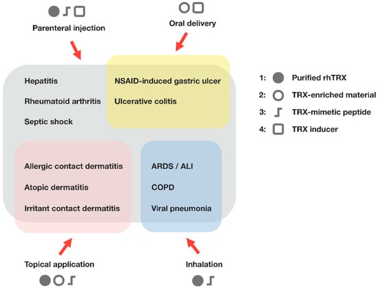 Transgenic overexpression of TRX and the systemic administration of recombinant human thioredoxin (rhTRX) are effective in a wide variety of in vivo inflammatory disease models, such as viral pneumonia, acute lung injury, pancreatitis, myocarditis, chronic obstructive pulmonary disease, and indomethacin-induced gastric injury (Figure 2). Elevated TRX levels in several primary tumors may suggest that TRX up-regulation in the cytosol can overwhelm the benefits of antioxidant/anti-inflammatory properties in a particular pathological condition, where compounds targeting TRX and TRX reductase can be effective [52,53,54,55]. However, a number of preclinical studies have demonstrated that extracellular TRX has a cytoprotective function under oxidative and inflammatory conditions, and no apparent evidence of adverse effects or undesirable symptoms have yet been found. The protective effects of TRX against inflammation and its potential clinical utility have been extensively reviewed elsewhere [56,57,58,59]. In this review, we describe the recent findings regarding the therapeutic applications of TRX and the strategies for TRX supplementation. In addition to the clinical use of TRX, we also discuss its potential utility as an attractive functional component of cosmetic products and dietary supplements.