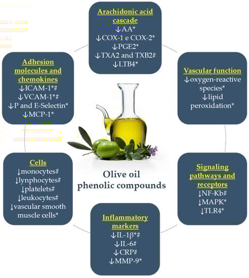 Studies on primary prevention have demonstrated the association between consumption of EVOO, naturally rich in phenolic compounds, and reduced risk of major cardiovascular events in patients at high risk for developing cardiovascular diseases [,]. Such an effect may be mediated by the control of modifiable risk factors and potential anti-inflammatory mechanisms of olive oil phenols [].