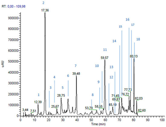 Identification was performed through the comparison of experimental data (chromatographic behavior, UV-Vis, MS and MSn spectra) with the literature, and with commercially available standard compounds, where possible. Figure 1 and Figure 2 show green and brown propolis extract chromatograms, acquired at 330 nm.