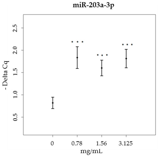 On the other hand, the levels of miR-203a-3p only increased in cell cultures treated with brown propolis, at all tested concentrations (χ2 = 41.92, df = 3, p < 0.001), when compared to the control sample (Figure 4). Green propolis did not induce any significant changes in the expression level of miR-203a-3p (data not shown).