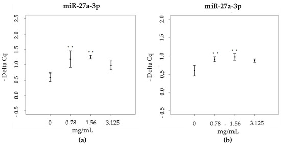miR-27a-3p expression levels (-Delta Cq) in HaCat cells, treated with increasing concentrations of (a) green propolis extract (0.78–3.125 mg/mL) and (b) brown propolis extract (0.78–3.125 mg/mL).