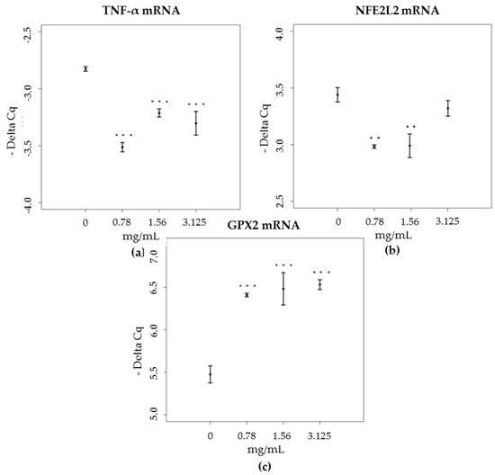 Expression levels (-Delta Cq) of mRNA coding for (a) TNF-α, in HaCat cells, treated with increasing concentrations of brown propolis extract (0.78–3.125 mg/mL), (b) NFe2L2, in HaCat cells, treated with increasing concentrations of brown propolis extract (0.78–3.125 mg/mL), (c) GPX2, in HaCat cells, treated with increasing concentrations of brown propolis extract (0.78–3.125 mg/mL).