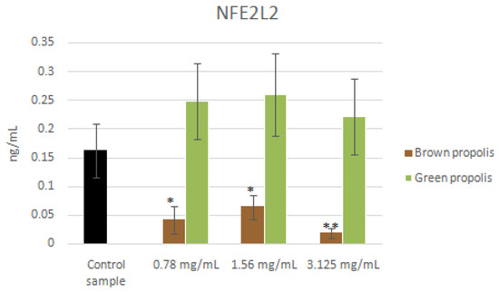 As far as NFE2L2 is concerned, brown propolis treatment induced a decrease in the concentration of the protein in HaCat cells at all concentrations tested (F = 9.4892, p < 0.05). In agreement with the mRNA expression levels (Figure 9), the green propolis treatment did not generate any significant changes in the concentration level of the protein, compared to the control sample (Figure 9).
