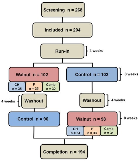 - Wu, L.; Piotrowski, K.; Rau, T.; Waldmann, E.; Broedl, U.C.; Demmelmair, H.; Koletzko, B.; Stark, R.G.; Nagel, J.M.; Mantzoros, C.S.; et al. Walnut-enriched diet reduces fasting non-hdl-cholesterol and apolipoprotein b in healthy caucasian subjects: A randomized controlled cross-over clinical trial. Metabolism 2014, 63, 382–391. [Google Scholar] [CrossRef] [PubMed]