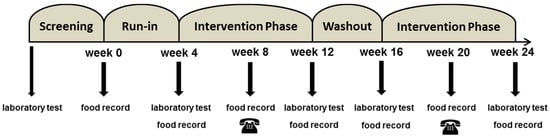 Study duration was six months (24 weeks) for each subject (Figure 2). Before starting the run-in period, subjects underwent counseling by a nutritionist, who evaluated dietary habits using a four-day dietary report that had been prepared by the participants during the preceding days. At the beginning and end of each diet phase, subjects were evaluated in the study center. Subjects met with a nutritionist at each follow-up visit, and a telephone follow-up was conducted regularly once during each diet phase. Prior to each visit, subjects were instructed to keep a four-day food record.