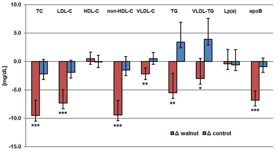 In a previous study, we investigated the effect of daily consumption of 43 g (1.5 oz) walnuts within a Western-type diet over eight weeks in healthy Caucasian men and postmenopausal women on lipid and glucose metabolism, adipokines, and endothelial function []. When compared with a control diet without walnuts, the walnut diet significantly reduced non-HDL cholesterol (non-HDL-C) and apolipoprotein B. Other fasting lipid parameters, as well as biomarkers of endothelial function, postprandial lipids, and glucose metabolism showed no significant changes.