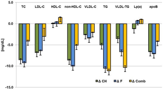 Within the tree nut family, walnuts have been found to be particularly promising in cardioprotective health. As one of the first, Sabaté et al. demonstrated the cholesterol-lowering effect of daily walnut consumption []. Our results showed a significant reduction in LDL-C (−7.3 mg/dL), which represents a reduction of 5.0%. These findings resonate with the results of our previous study [], in which a similar pattern was observed (non-HDL-C: −5.8%, TC: −3.9%, apoB: −6.2%, VLDL-C: −13.2%, TG: −5.4%, VLDL-TG: −4.0%). Our results suggest that the increased n-3-PUFA intake (15.0%) was principally responsible for the cholesterol-lowering effect of walnuts. There is evidence that a high n-3-PUFA intake provides cholesterol-lowering effects through several potential mechanisms []; however, the exact underlying mechanisms are still not fully understood.